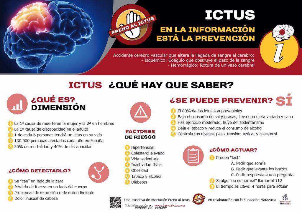 Sentir parálisis facial, perder la fuerza en las extremidades o tener visión borrosa son algunos de los signos de alarma que nos pueden indicar que estamos sufriendo un ictus o infarto cerebral. El ictus está considerada la primera causa de muerte en la mujer y la segunda a nivel general, una complicación que sufren cada día ocho murcianos, lo que supone cerca de 3.000 afectados cada año en la Región, pero que se puede prevenir en el 90 por ciento de los casos.