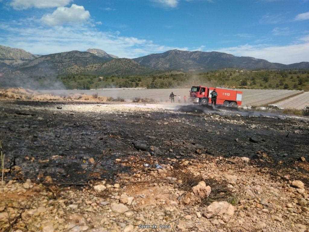 Agente medioambiental y Bomberos del Consorcio de Extinción de Incendios y Salvamento de la Región de Murcia han apagado una quema irregular de plásticos agrícolas muy próxima a terreno forestal en el paraje Cañada de Millas, en Aledo.
