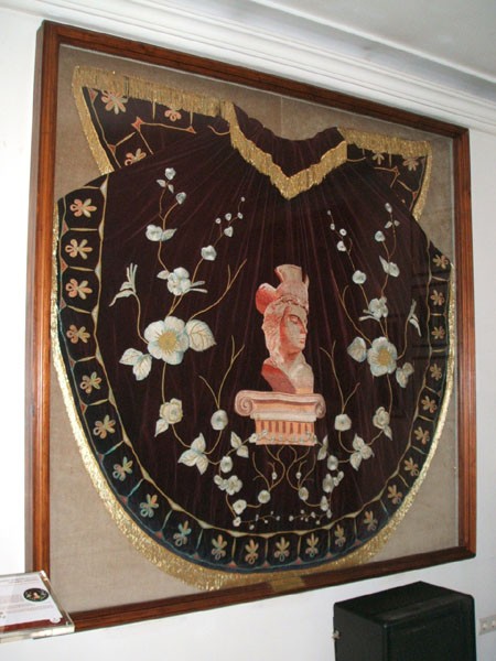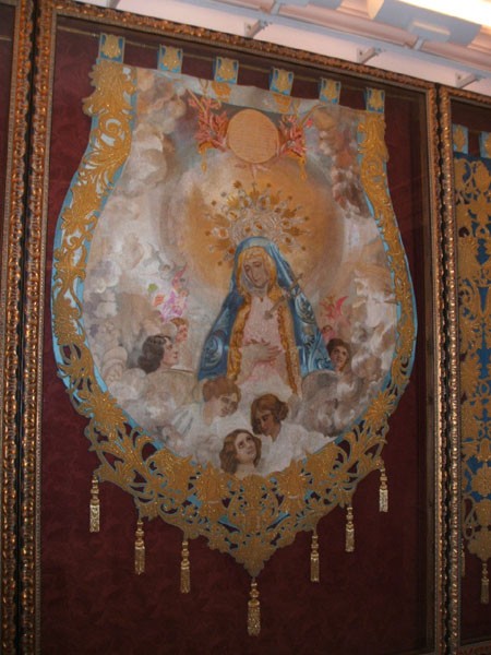 Frente a la recepción se puede apreciar el rostro de la Virgen de los Dolores, titular del Paso Azul, bordado en uno de los estandartes que forman parte del patrimonio de la Cofradía. Es obra de Emiliano Rojo.