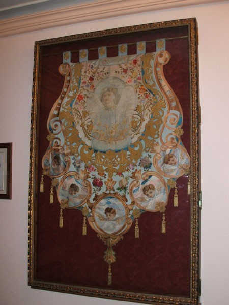 Frente a la recepción se puede apreciar el rostro de la Virgen de los Dolores, titular del Paso Azul, bordado en uno de los estandartes que forman parte del patrimonio de la Cofradía. Es obra de Emiliano Rojo.