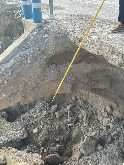 Una de ellas en el camino Venta de los Higos en la diputación de Hinojar, cuyo estado se ha agravado tras los últimos acontecimientos meteorológicos. «La base del terraplén del camino se ha quedado gravemente afectada en una longitud aproximada de unos 800 metros, quedando el pavimento de MBC en voladizo en varios tramos, con asentamientos del terraplén y grietas longitudinales en la pavimentación y cortes verticales de varios metros de altura producidos por la escorrentía», ha explicado Meca.