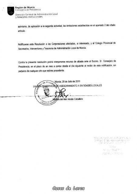 Habida cuenta de las críticas vertidas por Antonio Meca contra el interventor municipal, desde el Ayuntamiento se recuerda que este funcionario cuenta con autorización expresa por parte de la Dirección general de Administración Local desde julio de 2011 para la prestación de su trabajo en Lorca y Beniel, idéntica situación que presentan miles de funcionarios de habilitación nacional en toda España, incluidos varias ciudades de nuestra región.