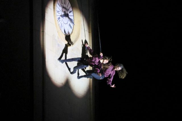 Dos hadas, Sira Cuenca y Alba Bonal, interpretaban la pieza de danza ‘Voló’. Un tránsito en el aire por distintas culturas, que aunaba técnicas de danza y acrobacia. Danza española, danzas regionales… y la tradición ancestral, mientras fusionaban acrobacia aérea, con la sincronicidad y la delicadeza de la danza. Mortales en plancha o agrupados, relevés, braceos, y cuartas, se daban la mano en el aire, donde la pared de la torre campanario de la antigua Colegial se convertía en el mejor de los escenarios.