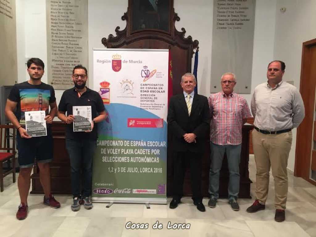 El Concejal de Deportes del Ayuntamiento de Lorca, Juan Francisco Martínez Carrasco, junto al Director General de Deportes de la CARM, Alonso Gómez, Antonio García, vicepresidente de la Federación Regional de Voleibol, y Daniel Navarro, de Volebol Eliocroca, han presentado el Campeonato de España Escolar de Voley Playa Cadete por selecciones autonómicas que se celebrará del 1 al 3 de julio en el Centro Internacional de Voley Playa de Lorca.