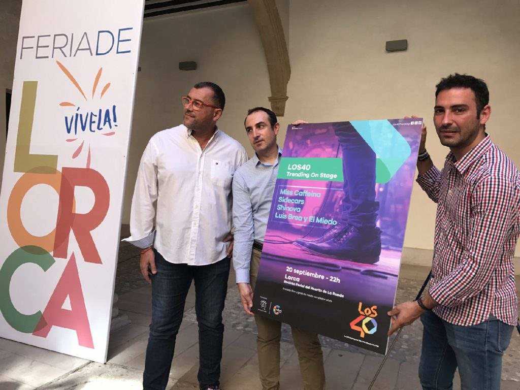 El Concejal de Festejos del Ayuntamiento de Lorca, Agustín Llamas, junto al Director de Radio Lorca-Cadena SER, Antonio Rosa, han presentado LOS40 Trending on Stage, festival musical que forma parte de la Feria de Lorca 2017 y que se celebrará el miércoles 20 de septiembre a partir de las 22 horas en el Huerto de la Rueda con entrada gratuita.