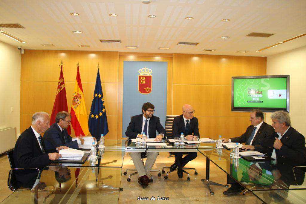 El presidente de la Comunidad, Fernando López Miras, se reunió hoy en el Palacio de San Esteban con los representantes de la Economía Social en la Región para ultimar los detalles del nuevo Pacto por la Economía Social con el que se prevén crear más de 10.500 nuevos puestos de trabajo y 250 empresas en la Región hasta el año 2020, período durante el cual estará en vigor esta estrategia que se firmará antes de que finalice el año.