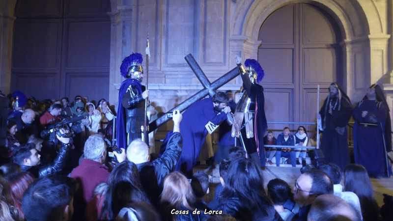 El guion y producción de este espectáculo fué del cofrade morado Mariano Llamas, que introduce nuevos matices en la Semana Santa lorquina y según el presidente de la cofradía morada Fulgencio Martinez Pelegrín, «este acto es una faceta distinta del adoctrinamiento religioso que nuestra cofradía realiza, y un complemento novedoso y plástico al rezo habitual que se creó en su momento como una peregrinación de sustitución para aquellas personas que no pueden acudir a Tierra Santa».