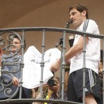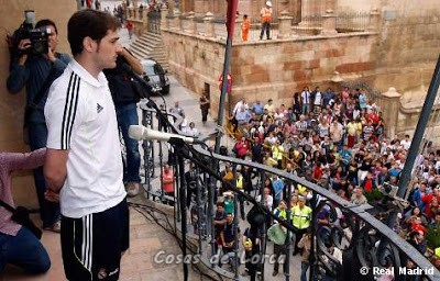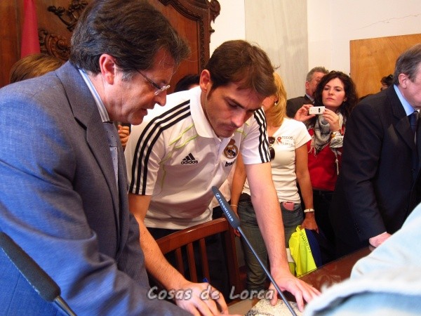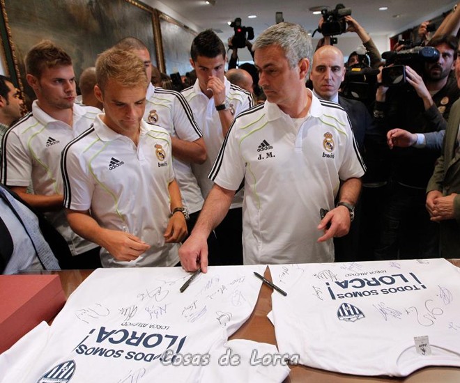 A continuación, todos los jugadores subieron al Ayuntamiento, donde firmaron el libro de honor y algunas camisetas. La expedición madridista salió al balcón, desde donde hablaron cuatro de ellos: Iker Casillas, Sergio Ramos, Florentino Pérez y Pedro León. Este último, natural de Mula, dio muestras de ser el más afectado. Mula, un municipio de la provincia de Murcia, se vio afectado por un terremoto en 1999, el primero que sufrió la Región de Murcia.