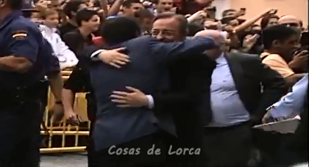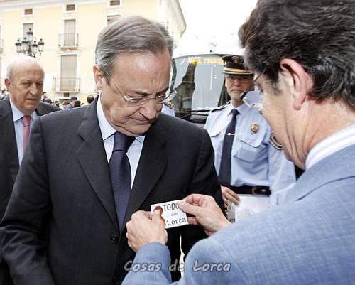 El Real Madrid llegó en autocar a una abarrotada plaza del Ayuntamiento de Lorca, donde fue recibido por el alcalde del municipio, Francisco Jodar. El autocar paró en la puerta y Florentino Pérez fue el primero en bajar. El presidente del Real Madrid se abrazó con el alcalde, que le colocó en la solapa una pegatina con el lema ‘Todos con Lorca’.