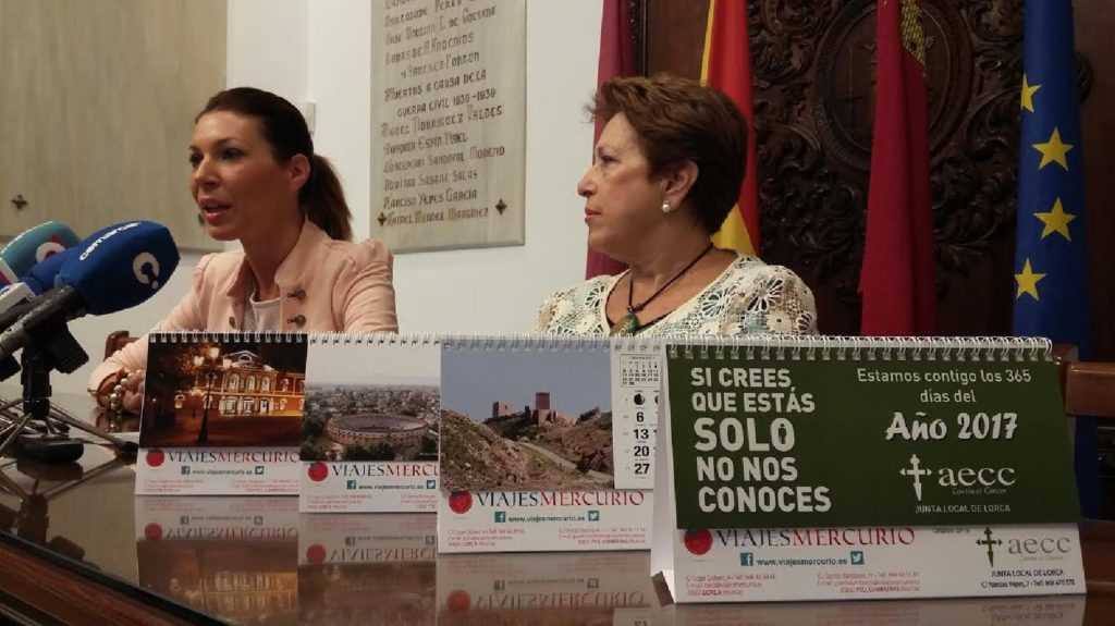 La Concejal de Sanidad en el Ayuntamiento de Lorca, María del Carmen Ruiz, junto a la Presidenta de la Asociación Española Contra el Cáncer (AECC) en nuestra ciudad, Magdalena López, han presentado esta mañana una nueva iniciativa de concienciación ciudadana y obtención de fondos que se inicia a partir de hoy. Se trata de la puesta a la venta de un calendario benéfico para el próximo año ilustrado con fotografías de diferentes enclaves lorquinos que han sido cedidas al efecto de forma altruista por parte de la fotógrafa María José Ruiz. El calendario de la AECC para 2017 contiene en total 13 fotografías, una para cada mes del año y otra más como portada, y ha sido impreso en color.