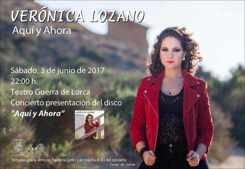 Verónica Lozano es una joven cantante lorquina, que actualmente está promocionando de su nuevo disco “Aquí y Ahora” de estilo pop, que presentará en Lorca el 3 de junio. Esta lorquina lleva una intensa carrera musical, interpreta diversos estilos que van desde el flamenco, la copla y el jazz hasta el pop, pop español, pop rock y la balada.
