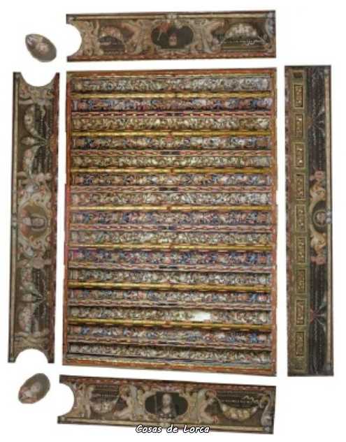 – El techo, a modo de cielo se decora con motivos vegetales o de aves y querubines.La obra está realizada con forjados de jácenas con un total de seis ménsulas (tres por lado), viguetas de madera que forman revoltones, cuya parte baja se dora y talla con motivos de hojas.