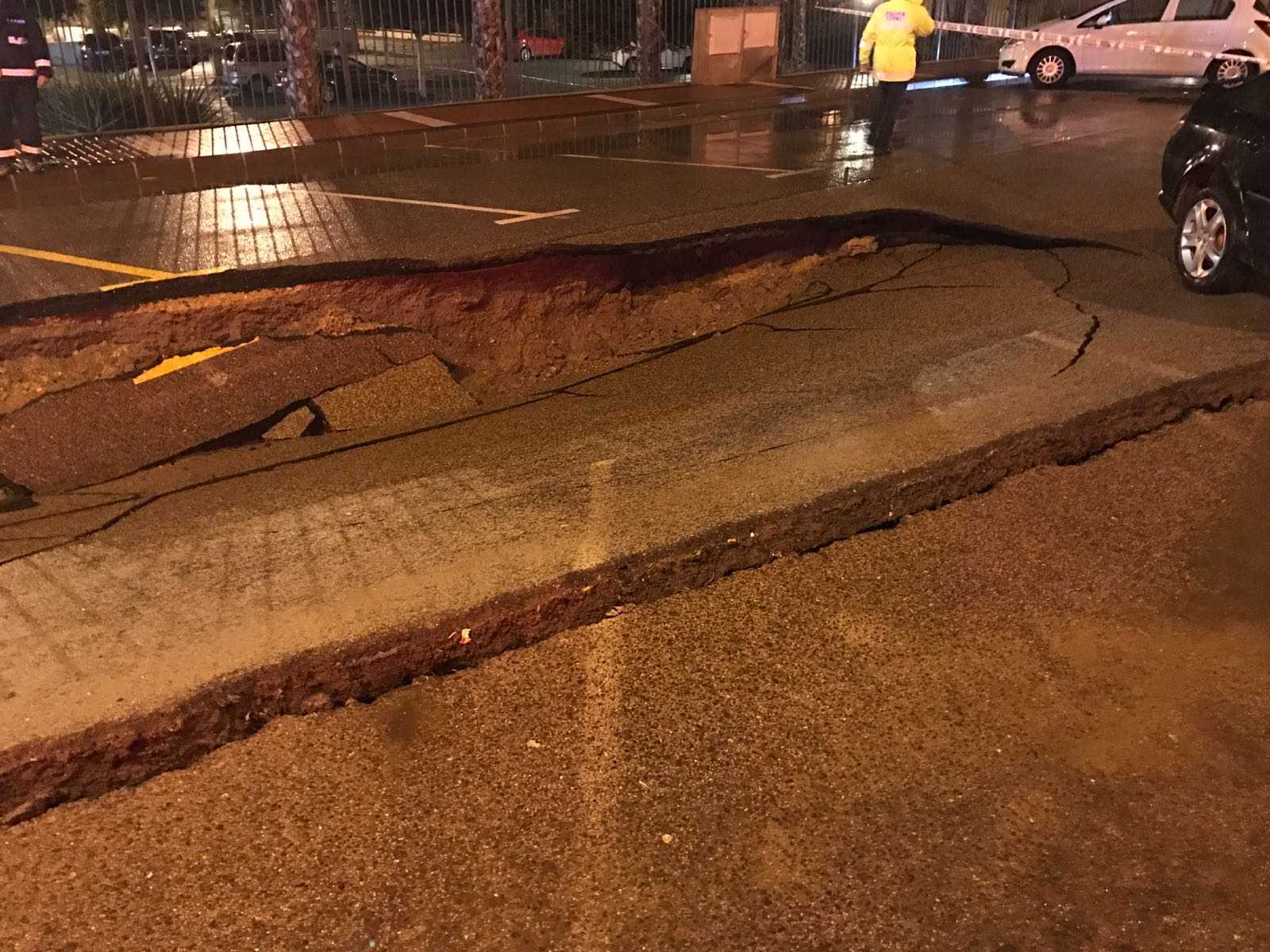 El dispositivo municipal de seguridad ha acordonado un área de 4×6 metros en el aparcamiento de salones El Faroli por hundimiento del firme después de rescatar ilesa a la persona que conducía el vehículo afectado.