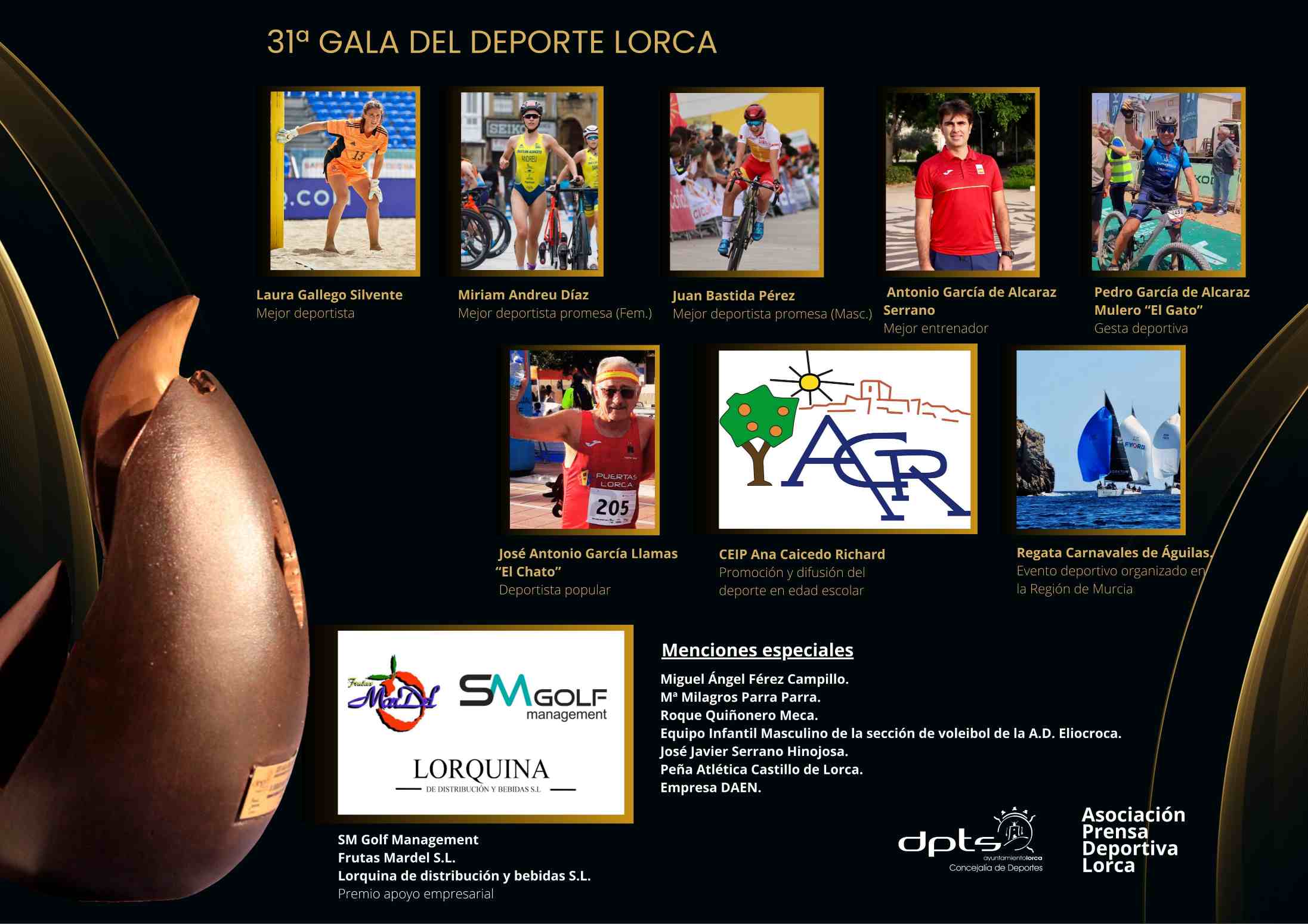 – El Premio Empresarial se entregará a las empresas que han mostrado un apoyo destacado al deporte en Lorca. Entre ellas se encuentran SM Golf Management S.L. (por su apoyo al baloncesto), Frutas Mardel S.L. (por su colaboración con el balonmano) y Lorquina de distribución y bebidas S.L. (por su apoyo ininterrumpido a la Media Maratón Ciudad de Lorca desde 2006).