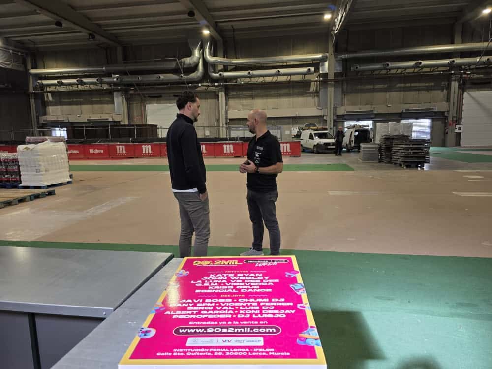 El concejal de Talento Joven del Ayuntamiento de Lorca, Antonio David Sánchez, junto con el promotor del evento, Luis Giménez, han supervisado esta mañana los últimos trabajos de montaje y coordinación técnica del festival ‘90’s & 2MIL, el remember de tu vida’, que se celebrará este sábado, 15 de noviembre, en el Palacio de Ferias y Congresos, y que convertirá de nuevo al municipio en epicentro musical del sureste español. “Lorca no para. Este viernes rematamos el montaje para que mañana todo funcione como un reloj: accesos, sonido, iluminación, equipos y la coordinación con seguridad y emergencias” ha destacado el edil.