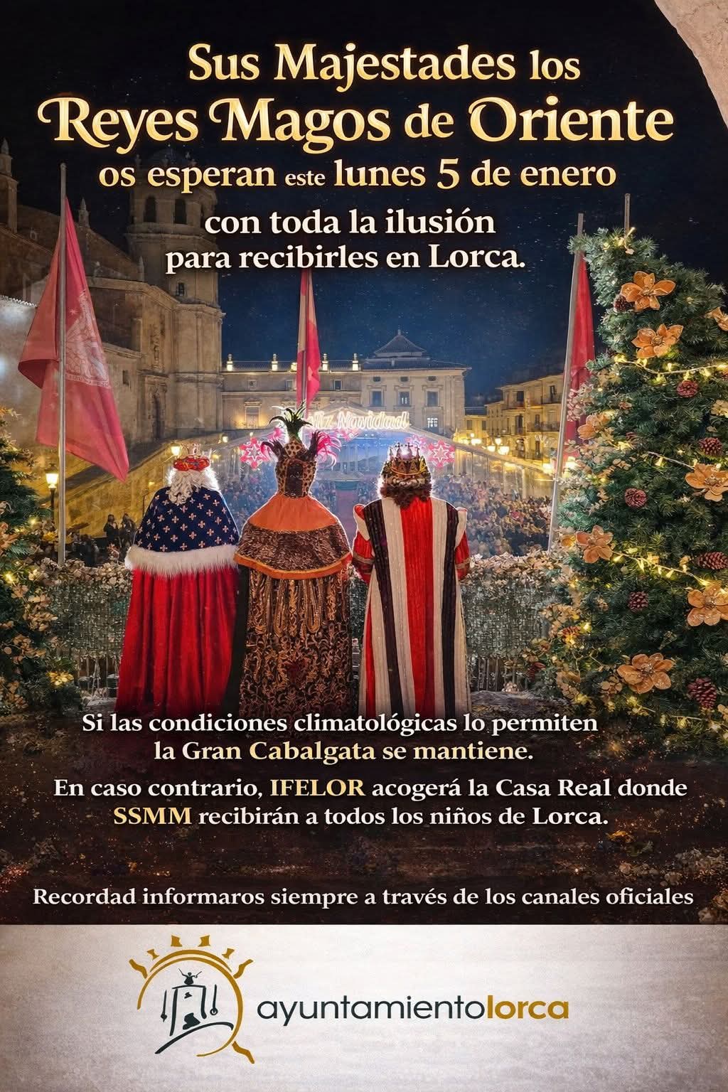 La previsión de fuertes lluvias de la Agencia Estatal de Meteorología (Aemet) ha llevado a que desde hace varios días se lleve un especial seguimiento del tiempo para plantear distintos escenarios si fuera necesario. “El aviso de fenómenos meteorológicos adversos en todo el país, con tormentas fuertes y nieve en cotas bajas por la borrasca ‘Francis’, nos ha llevado a plantearnos distintas posibilidades si fuera necesario. Pero lo que queremos que quede muy claro es que LOS REYES MAGOS VAN A VENIR A LORCA y que NINGÚN NIÑO SE VA A QUEDAR SIN VER A LOS REYES MAGOS SI QUIERE. Entre las previsiones está crear un mundo mágico y de ilusión en torno a los Reyes Magos en el pabellón principal de Ifelor, donde Melchor, Gaspar y Baltasar recibirían a todos los niños lorquinos, aunque aún es prematuro hablar de esta y otras posibilidades”.