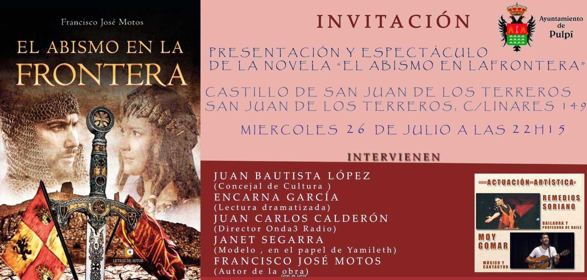 Presentación y espectáculo en el que actuarán la gran bailaora Remedios Soriano, y el gran músico y cantautor Moy Gomar. Novela histórica ambientada en 1465; en un entorno maravilloso como la explanada del Castillo de San Juan de Los Terreros.