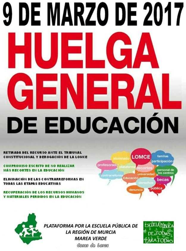 La plataforma por la Escuela Pública de la Región de Murcia de la que los socialistas forman parte activa, exige la derogación de la LOMCE, la revisión de los recortes y el fin del proceso de privatización de la enseñanza pública, garantizando así el derecho a la igualdad de oportunidades en el acceso a la Educación.