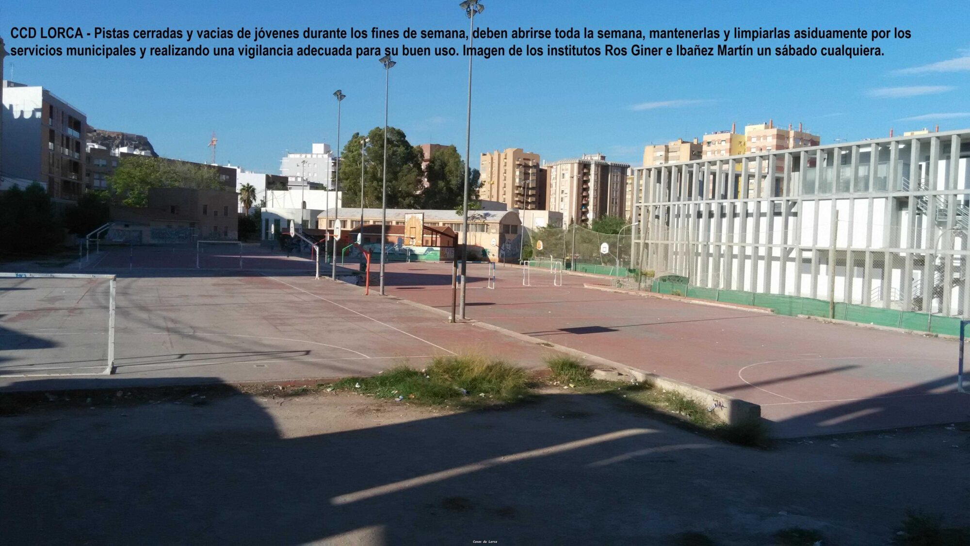 Otros grupos políticos como CCD Lorca, también se hicieron eco de las demandas de muchos ciudadanos, reclamando la mejora de las instalaciones y cambio de horarios y usos del recinto de los institutos.