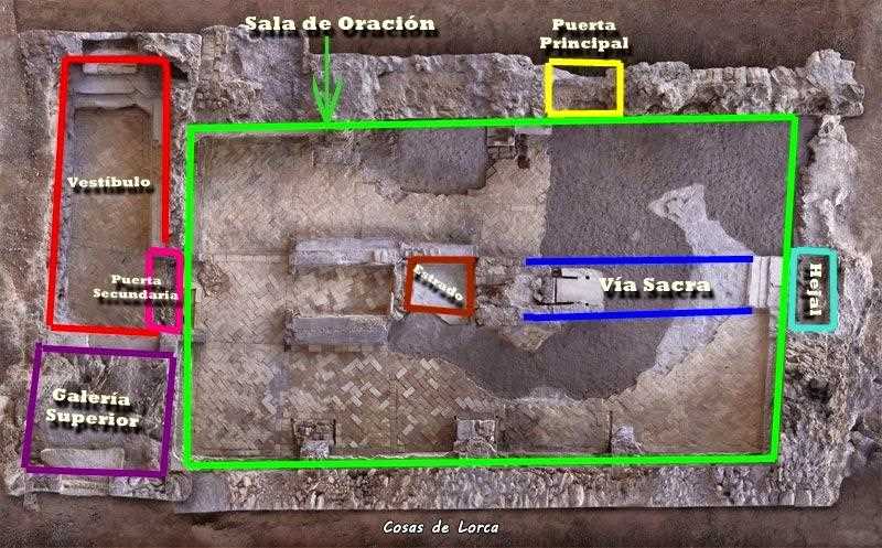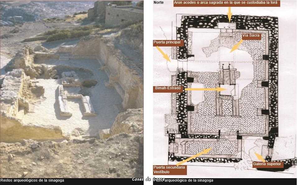 El templo lorquino se sitúa a escasos metros de la ermita cristiana dedicada a la advocación de San Clemente y está excavada en el terreno -lo que ha permitido su fosilización y conservaciónporque según la normativa de la época no podía destacar en altura sobre las iglesias y reproduce elementos típicos de los templos hebreos con un vestíbulo, oratorio y un graderío específico para mujeres.