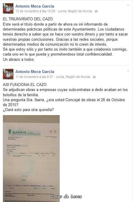 Mientras continua con su cruzada personal contra la edil de contratación de obras, parques y jardines, doña Eulalía Ibarra, haciendo publicos en su perfil personal de facebook distintos documentos que según él, probarían que existe «tráfico de influencias» en dichas contrataciones.
