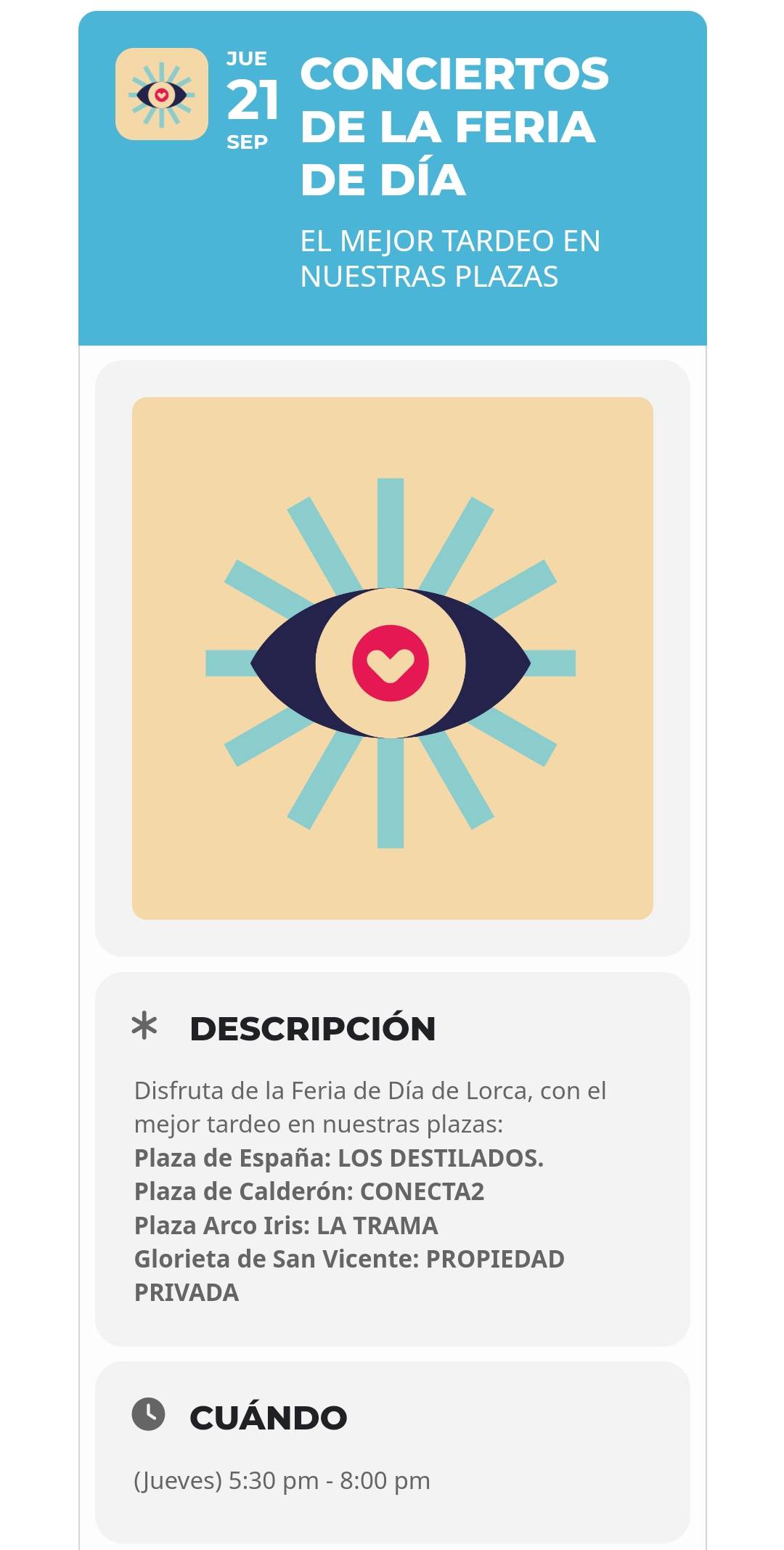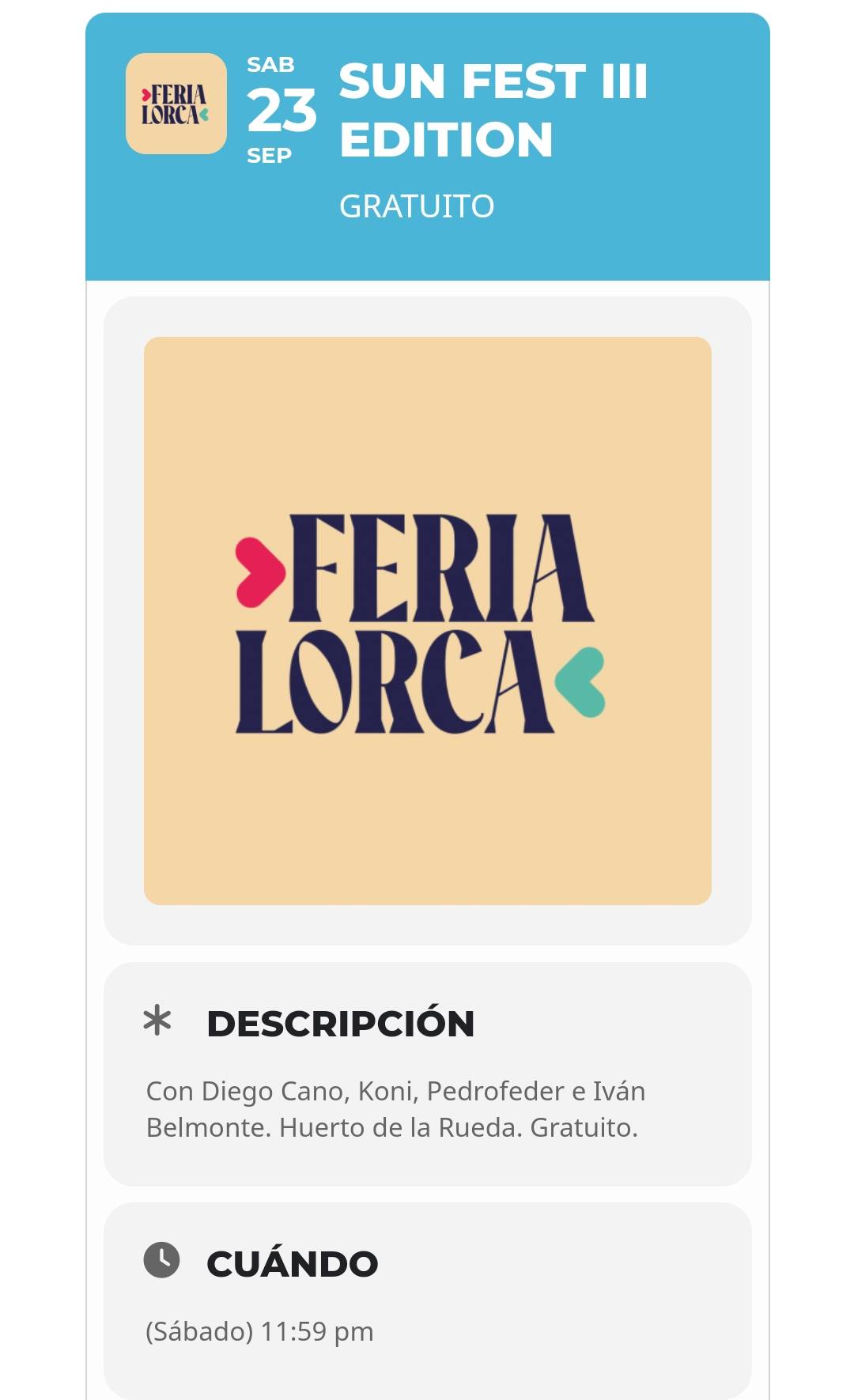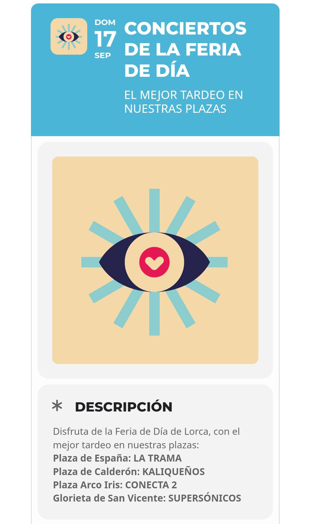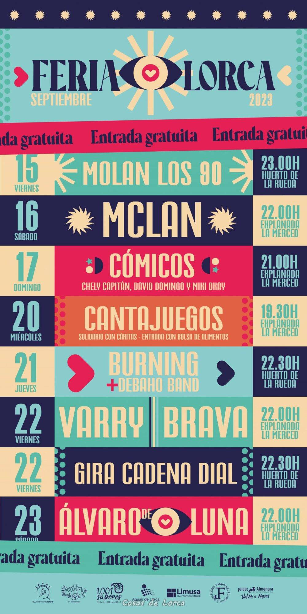 Durante los días 16 y 17 de septiembre (sábado y domingo), así como del 21 al 24 de septiembre (de jueves a domingo), se llevarán a cabo un total de 28 conciertos que comenzarán a partir de las 17:30 horas en lugares emblemáticos de nuestro casco antiguo como la Plaza de España, Plaza de Calderón, Plaza Arco Iris, Glorieta San Vicente y la novedad de este año: Plaza Real, que se convertirá en un punto de encuentro especial para los jóvenes lorquinos, con una programación de djs entre los que se encuentran Diego Cano, Pedro Feder, Iván Belmonte y Requena”.