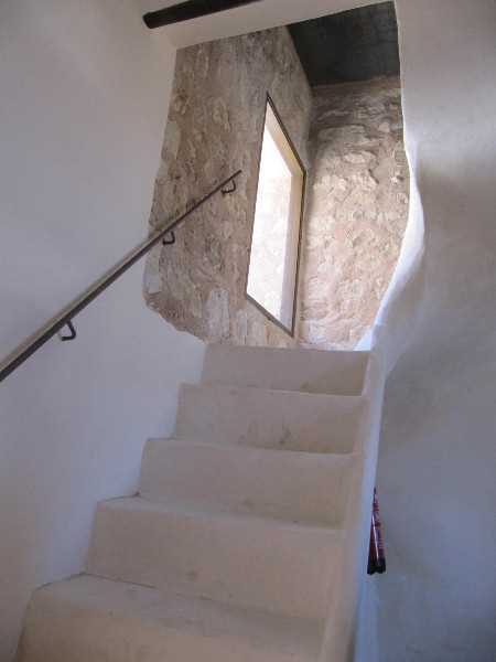 El interior de la torre se desarrolla por medio de una escalera de mortero de yeso que da acceso a las diversas estancias, estas escaleras se apoyan en un muro de grosor medio que parte a la torre longitudinalmente de arriba abajo y que sirve de apoyo a las estancias que debieron desarrollarse en su interior; la cubierta es de postes de madera y todo el interior se enlució con yeso blanco y azul; por supuesto, toda esta parte de la obra es ya de Época Moderna.