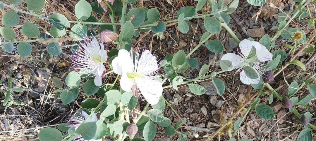 Tras tomar el camino de las Teresas hemos continuado descendiendo por un camino zigzagueante, pasando por varios cortijos arruinados, en las márgenes se aprecian floridas tapeneras, tomillo blanco y toda una serie de plantas arbustivas que aromatizan el ambiente, mientras una hermosa águila planea llevada por el aire y aparecen unas alcibaras con el alto tallo floreciente. Pasamos junto a un coche abandonado que nos comentan está allí para ser utilizado como puesto de caza y seguimos descendiendo entre tramos cubiertos de pinos y otros a cielo abierto. El clima llevadero nos acompaña durante toda la ruta, ya que los cielos están algo cubiertos y suele moverse algo de aire.