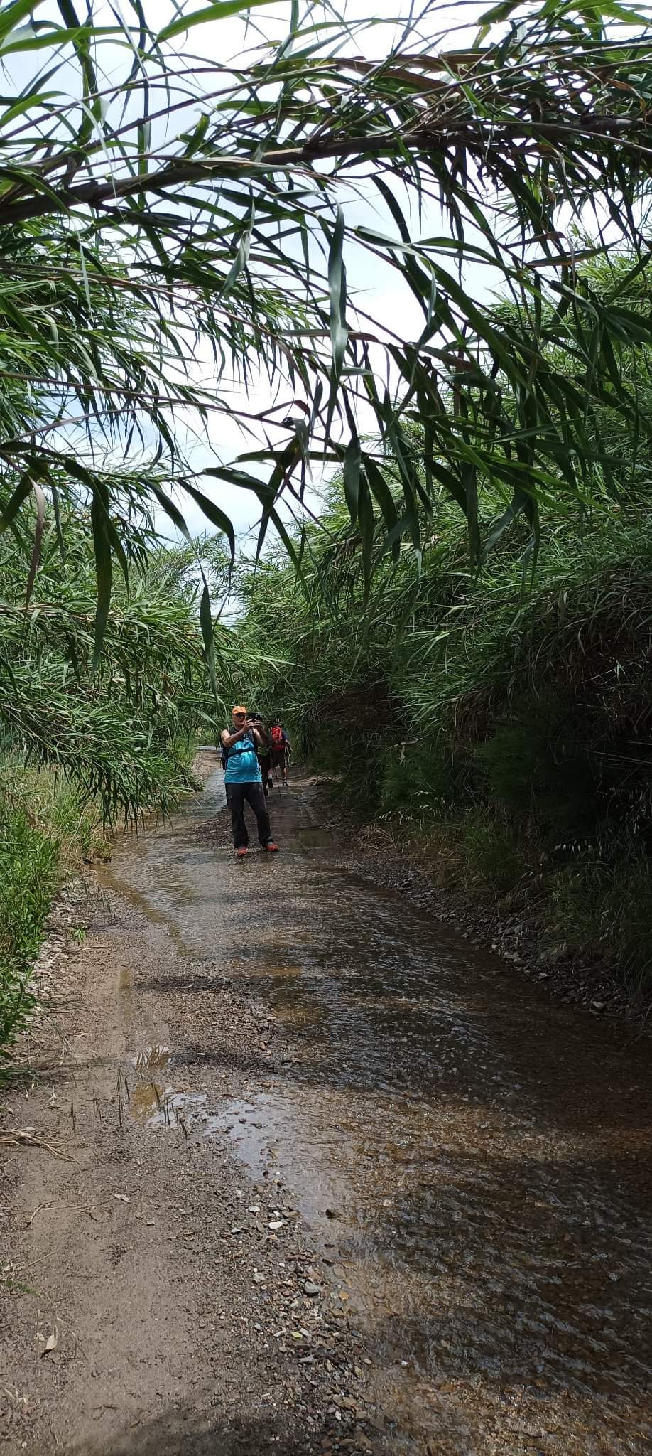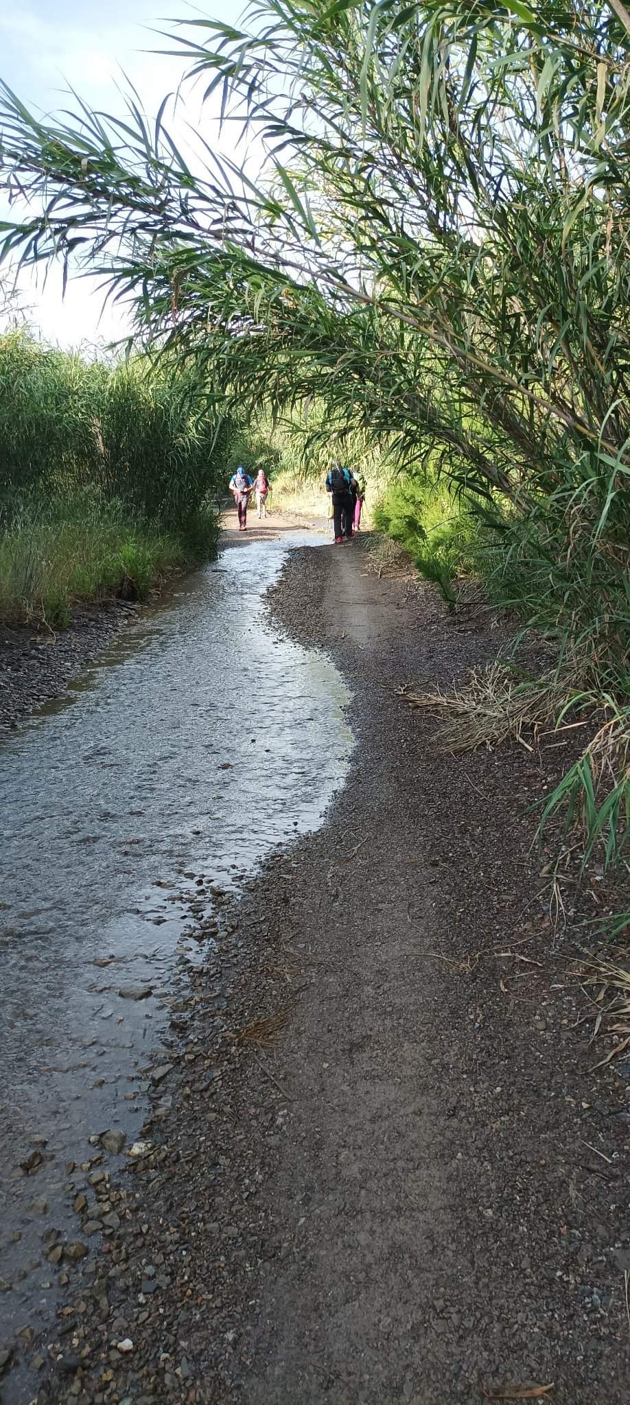 Los primeros 4 km han sido de un auténtico placer al caminar por ambas márgenes de la rambla sorteando el cauce y la vegetación que en los lindes estaba crecida, fundamentalmente de cañas y de molestas zarzas. Había que ir atento para no meter los pies en las zonas donde el cauce estaba más profundo, aún así, en algunas ocasiones las zapatillas se han sumergido. La ayuda de los bastones ha venido muy bien para apoyarnos en los continuos saltos para vadear el cauce.