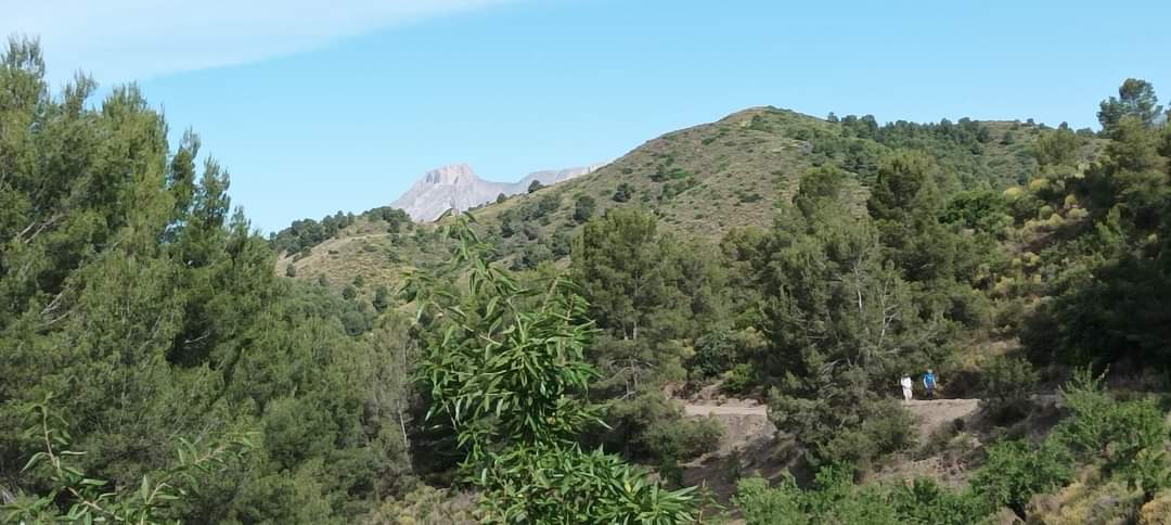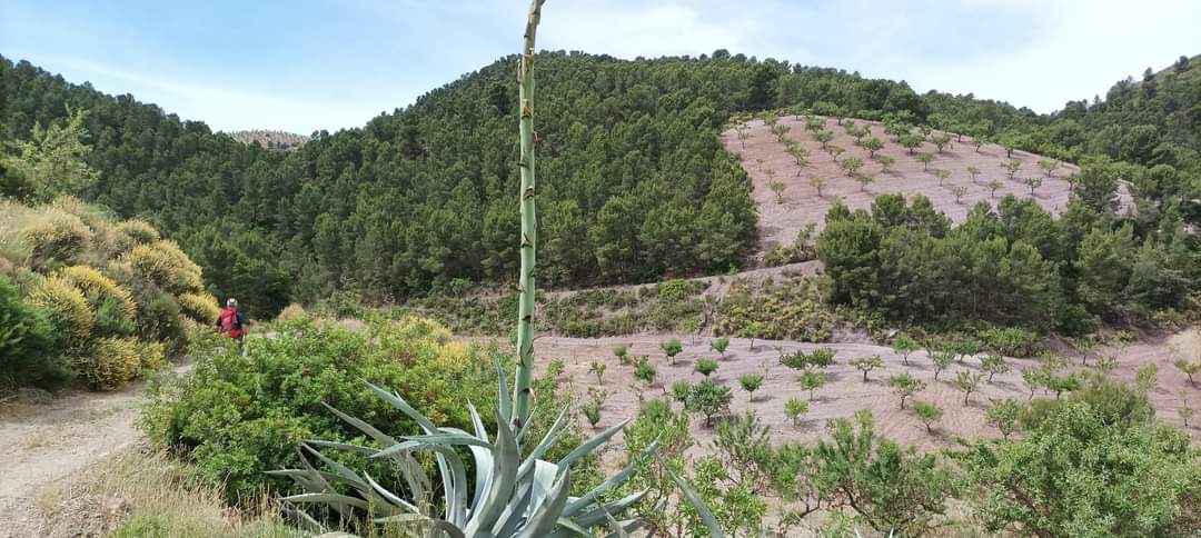 Tras tomar el camino de las Teresas hemos continuado descendiendo por un camino zigzagueante, pasando por varios cortijos arruinados, en las márgenes se aprecian floridas tapeneras, tomillo blanco y toda una serie de plantas arbustivas que aromatizan el ambiente, mientras una hermosa águila planea llevada por el aire y aparecen unas alcibaras con el alto tallo floreciente. Pasamos junto a un coche abandonado que nos comentan está allí para ser utilizado como puesto de caza y seguimos descendiendo entre tramos cubiertos de pinos y otros a cielo abierto. El clima llevadero nos acompaña durante toda la ruta, ya que los cielos están algo cubiertos y suele moverse algo de aire.
