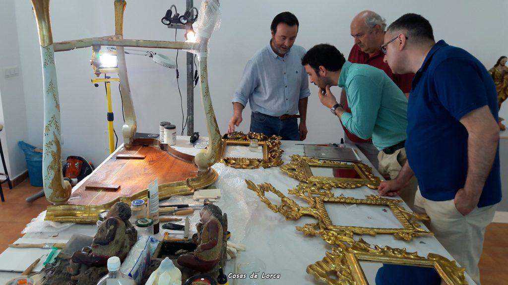 El Concejal de Cultura en el Ayuntamiento de Lorca, Agustín Llamas, ha supervisado esta mañana los trabajos de recuperación y rehabilitación de bienes muebles, pinturas y lámparas pertenecientes al patrimonio inventariado del Palacio de Guevara que se están desarrollando por parte de un licenciado especialista en la materia.